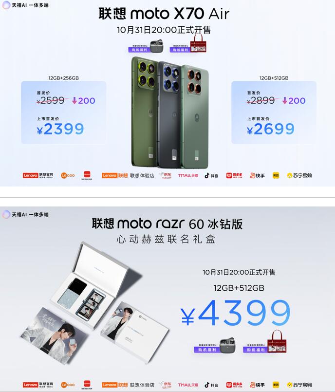 联想 moto razr 60 心动赫兹联名礼盒售价 4399 元,购买礼盒的用户还有机会获得 “赫你相遇” 限定礼袋,内含张凌赫独家写真透卡、定制款痛包及丰富限定周边,福利满满。此外,联想 moto g100 AI 手机已正式开售,售价 1399 元起;主打高性价比的联想 moto g100s AI 手机将于 11 月 7 日开启预售,售价 999 元起,特别适合喜欢 LCD 屏幕的用户。